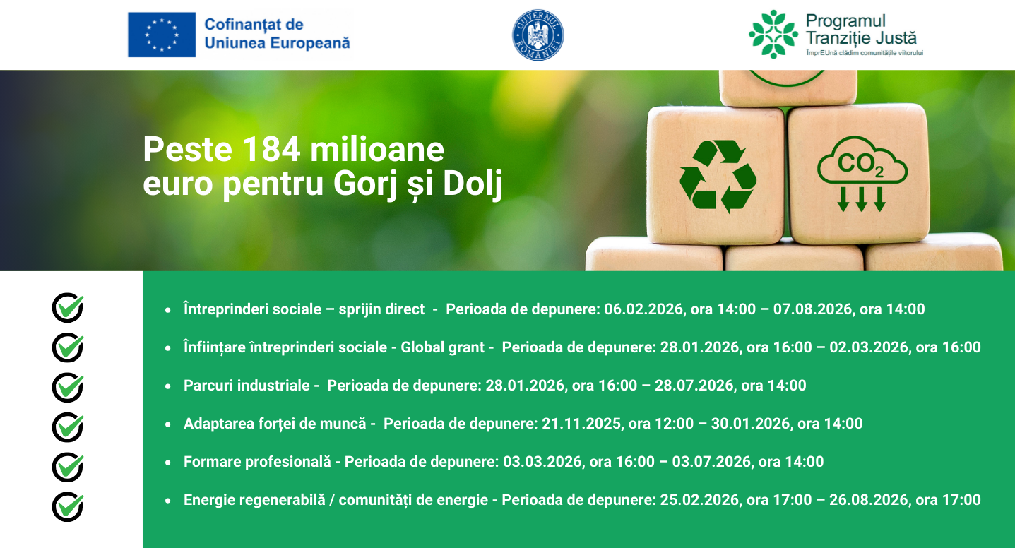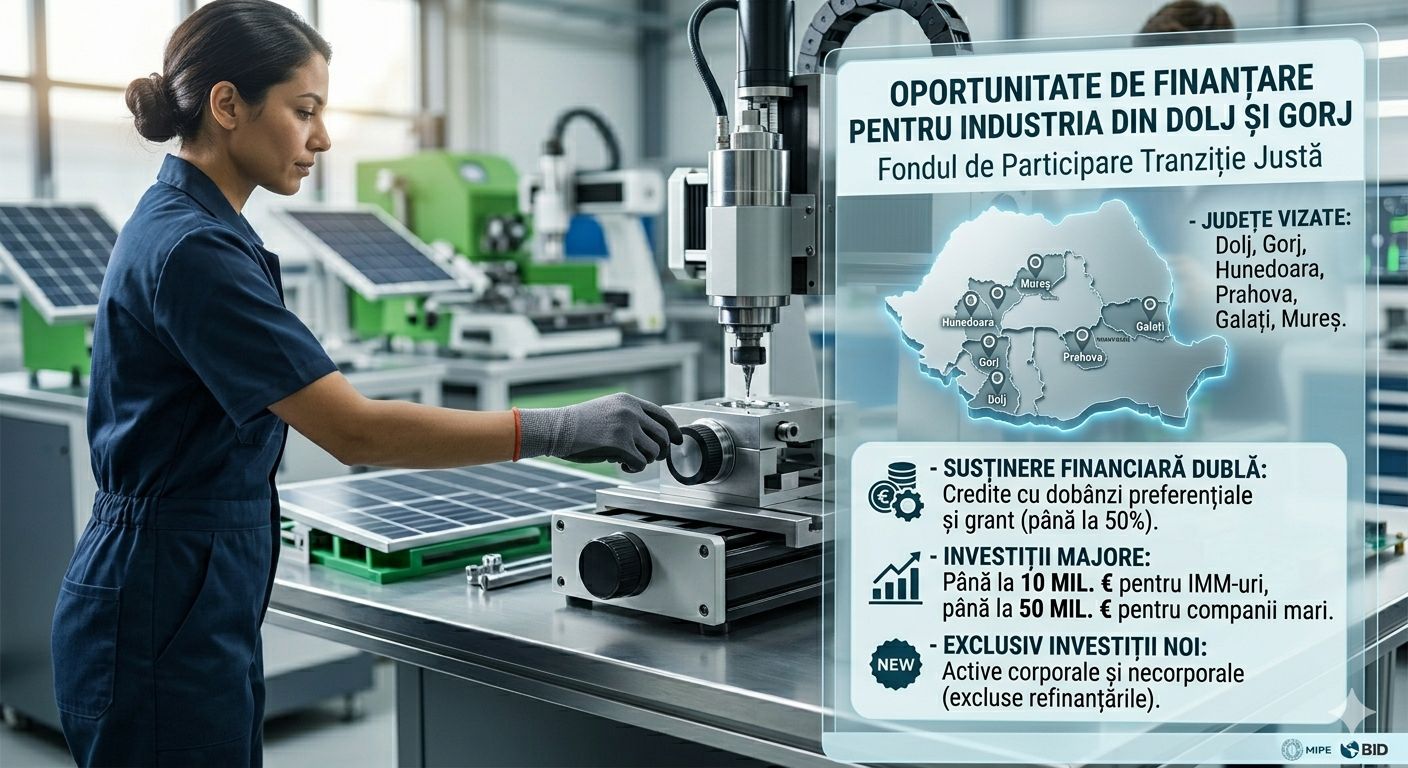 Oportunitate de finanțare pentru industria din Dolj și Gorj, prin Fondul de Participare Tranziție Justă!