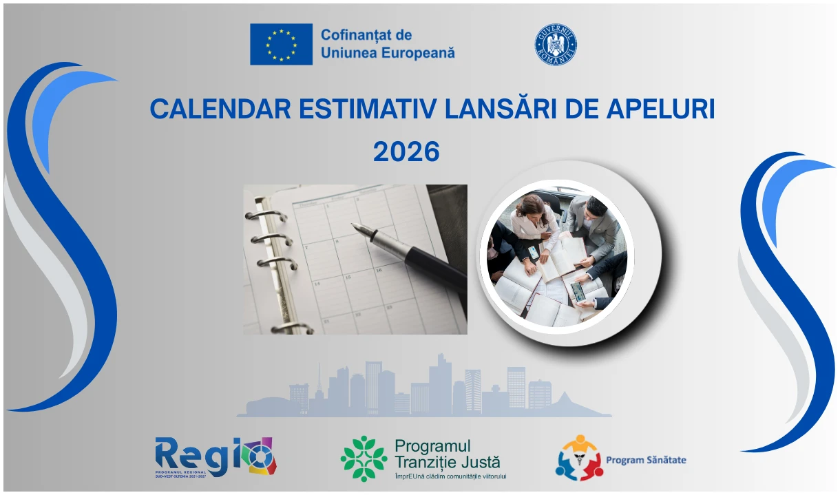 Ministerul Investițiilor și Proiectelor Europene a publicat calendarul estimativ consolidat al lansărilor de apeluri de proiecte pentru anul 2026, un instrument util de orientare pentru toți potențialii beneficiari de fonduri europene: autorități publice, organizații neguvernamentale, mediul de afaceri, instituții de educație și cercetare, precum și alți actori interesați. Documentul oferă o imagine de ansamblu asupra oportunităților de finanțare preconizate pentru acest an, incluzând aproximativ 300 de apeluri de proiecte, cu o valoare totală estimată de peste 6,6 miliarde euro, din care 5,14 miliarde euro reprezintă fonduri europene. Pentru fiecare apel sunt prezentate informații orientative privind perioada estimată de lansare, tipologia apelului, domeniul de intervenție, aria geografică vizată și bugetele indicative.