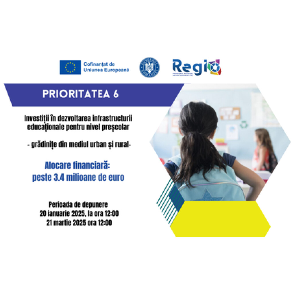 Agenția pentru Dezvoltare Regională (ADR) Sud-Vest Oltenia, în calitate de Autoritate de Management pentru Programul Regional Sud-Vest (PR SV) Oltenia 2021-2027, anunță începerea perioadei de depunere a cererilor de finanțare pentru apelul de proiecte destinat infrastructurii educaționale pentru nivelul preșcolar. Perioada de depunere a cererilor de finanțare: 20 ianuarie 2025, ora 12:00 – 21 martie […]