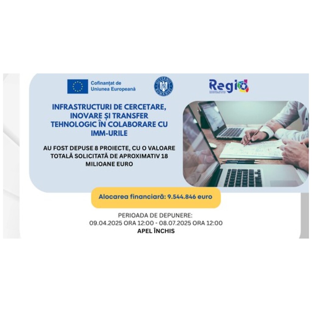 ADR Sud-Vest Oltenia anunță încheierea perioadei de depunere a proiectelor în cadrul apelului dedicat infrastructurilor de cercetare, inovare și transfer tehnologic, realizate în parteneriat cu IMM-urile, lansat prin Programul Regional Sud-Vest Oltenia 2021–2027. Acest apel vizează consolidarea capacității de cercetare și inovare în domenii prioritare de specializare inteligentă (RIS3), contribuind direct la creșterea competitivității regionale […]
