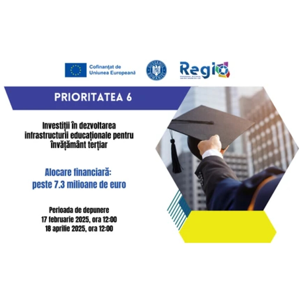 Agenția pentru Dezvoltare Regională (ADR) Sud-Vest Oltenia, în calitate de Autoritate de Management pentru Programul Regional (PR) Sud-Vest Oltenia 2021-2027, anunță publicarea Corrigendumului 4 pentru apelul „Investiții în dezvoltarea infrastructurii educaționale pentru învățământ terțiar”, Prioritatea 6 – Educație modernă și incluzivă. Se modifică astfel Capitolul 3.3. Bugetul alocat apelului de proiecte Ghidul și anexele pot fi consultate aici.