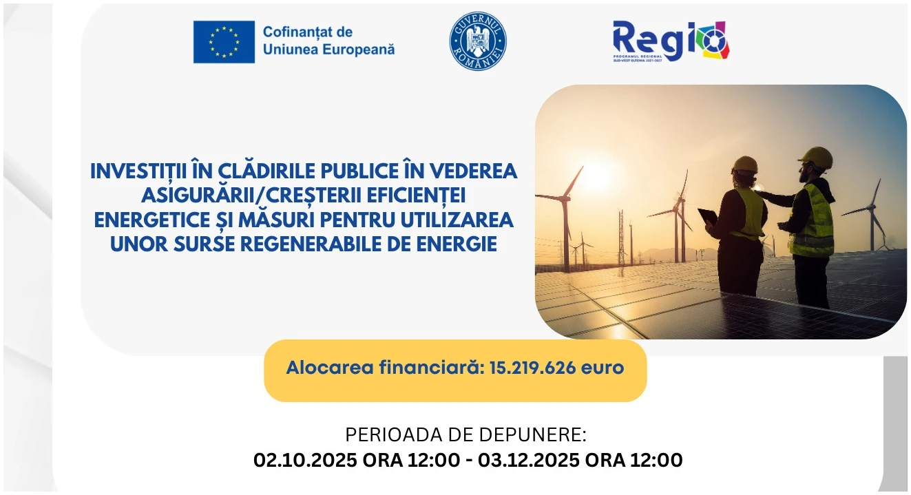 Agenția pentru Dezvoltare Regională (ADR) Sud-Vest Oltenia, în calitate de Autoritate de Management pentru Programul Regional (PR) Sud-Vest Oltenia 2021-2027, lansează apelul de proiecte „Investiții în clădirile publice în vederea asigurării/creșterii eficienței energetice și măsuri pentru utilizarea unor surse regenerabile de energie” – apelul 2.