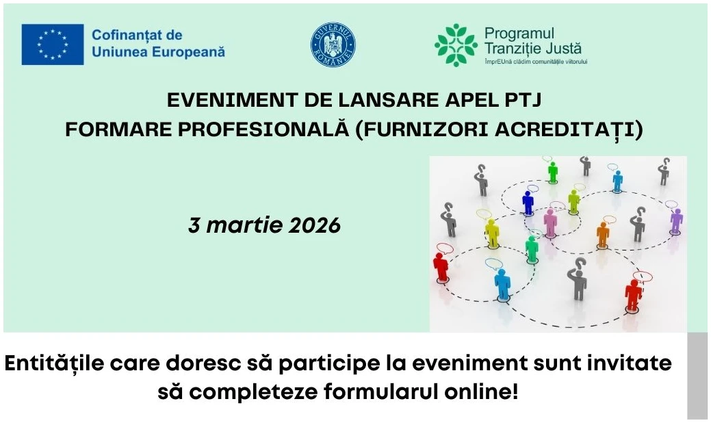 ADR Sud-Vest Oltenia organizează un eveniment de informare online dedicat componentei „Sprijin pentru modernizarea și consolidarea instituțiilor și serviciilor pieței forței de muncă, Formare profesională – furnizori acreditați”, în cadrul Programului Tranziție Justă 2021–2027.